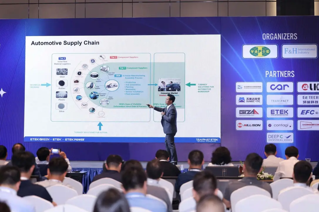 Tại diễn đàn, ông Nguyễn Trọng Thưởng – Tổng Giám đốc ETEK, đã có bài trình bày ấn tượng với chủ đề: “Vietnam Automotive Supply Chain”, phân tích sâu sắc xu hướng phát triển ngành công nghiệp ô tô tại Việt Nam trong bối cảnh mới. Bài phát biểu nhấn mạnh những thách thức và tiềm năng của Việt Nam trong việc tham gia vào chuỗi cung ứng ô tô toàn cầu, đồng thời đưa ra các giải pháp công nghệ, thiết bị và mô hình sản xuất mà ETEK có thể cung cấp để hỗ trợ doanh nghiệp nội địa nâng cao năng lực cạnh tranh.
